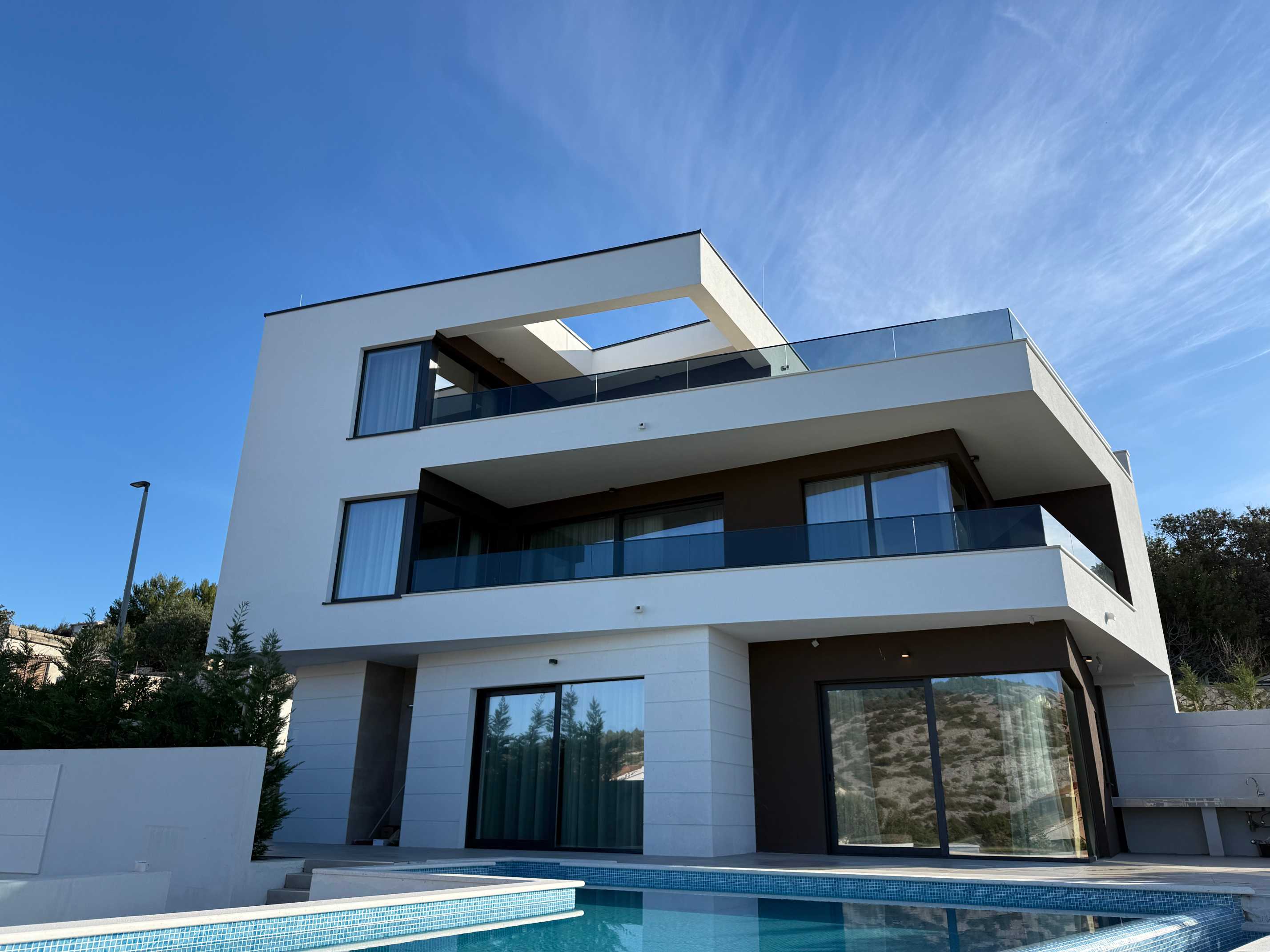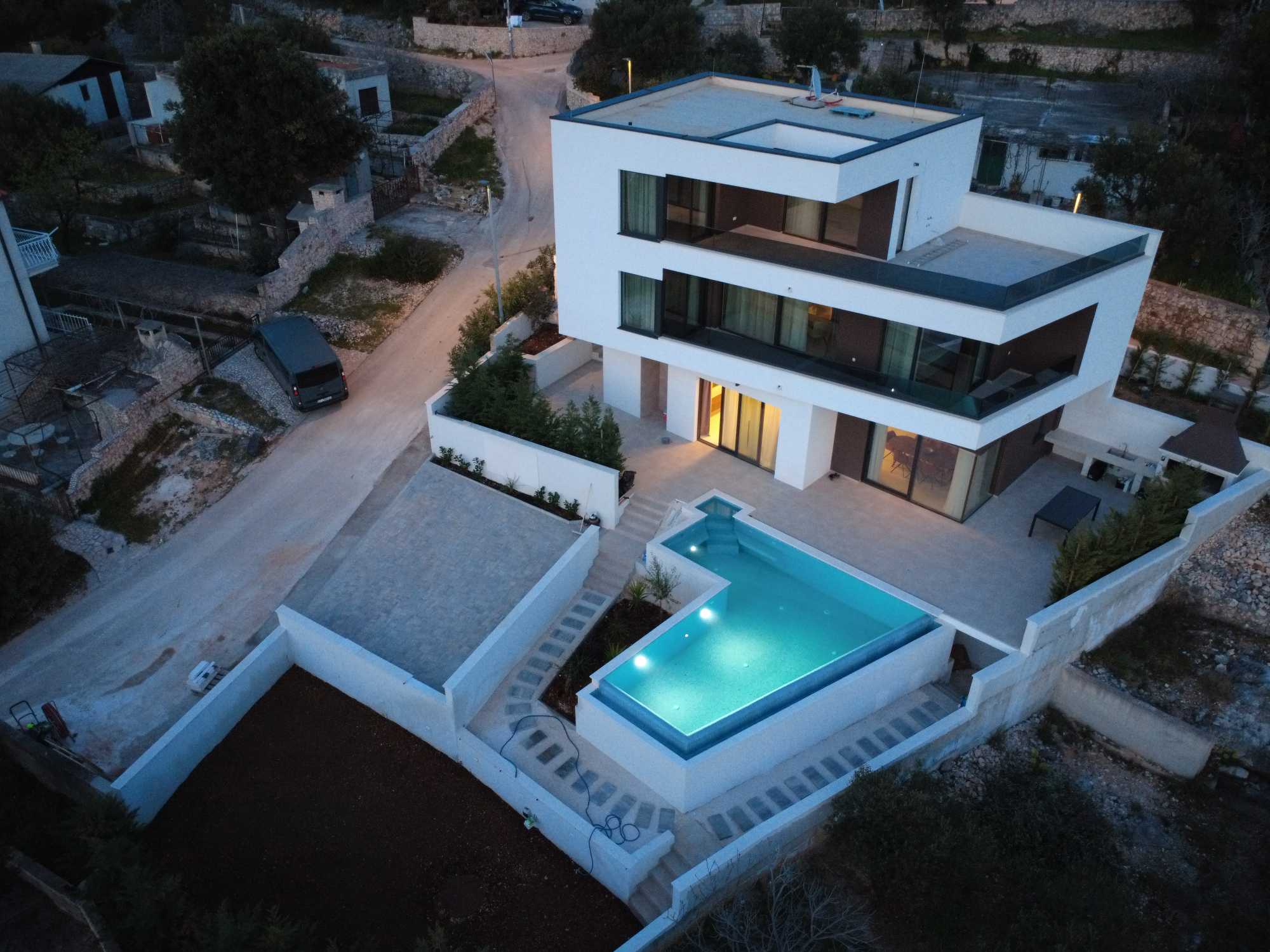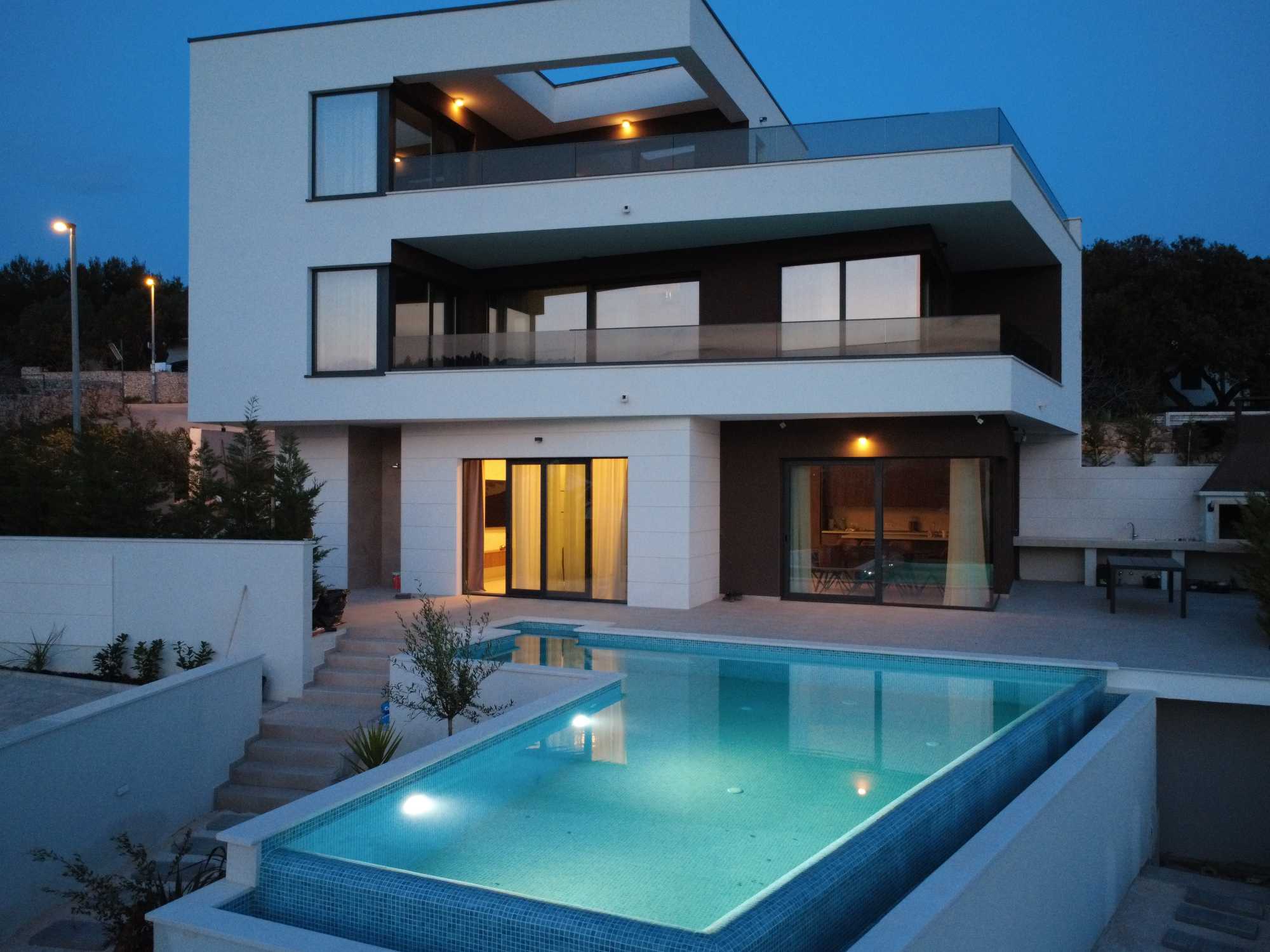 Izvanredna luksuzna vila smještena je na području Rogoznice, svega 100 metara od mora, s prekrasnim pogledom na Jadran s svakog kata. Nalazi se na mirnoj lokaciji, na samom spoju dviju lokalnih cesta koje prelaze u slijepu ulicu, što omogućuje jednostavan pristup i potpunu privatnost.