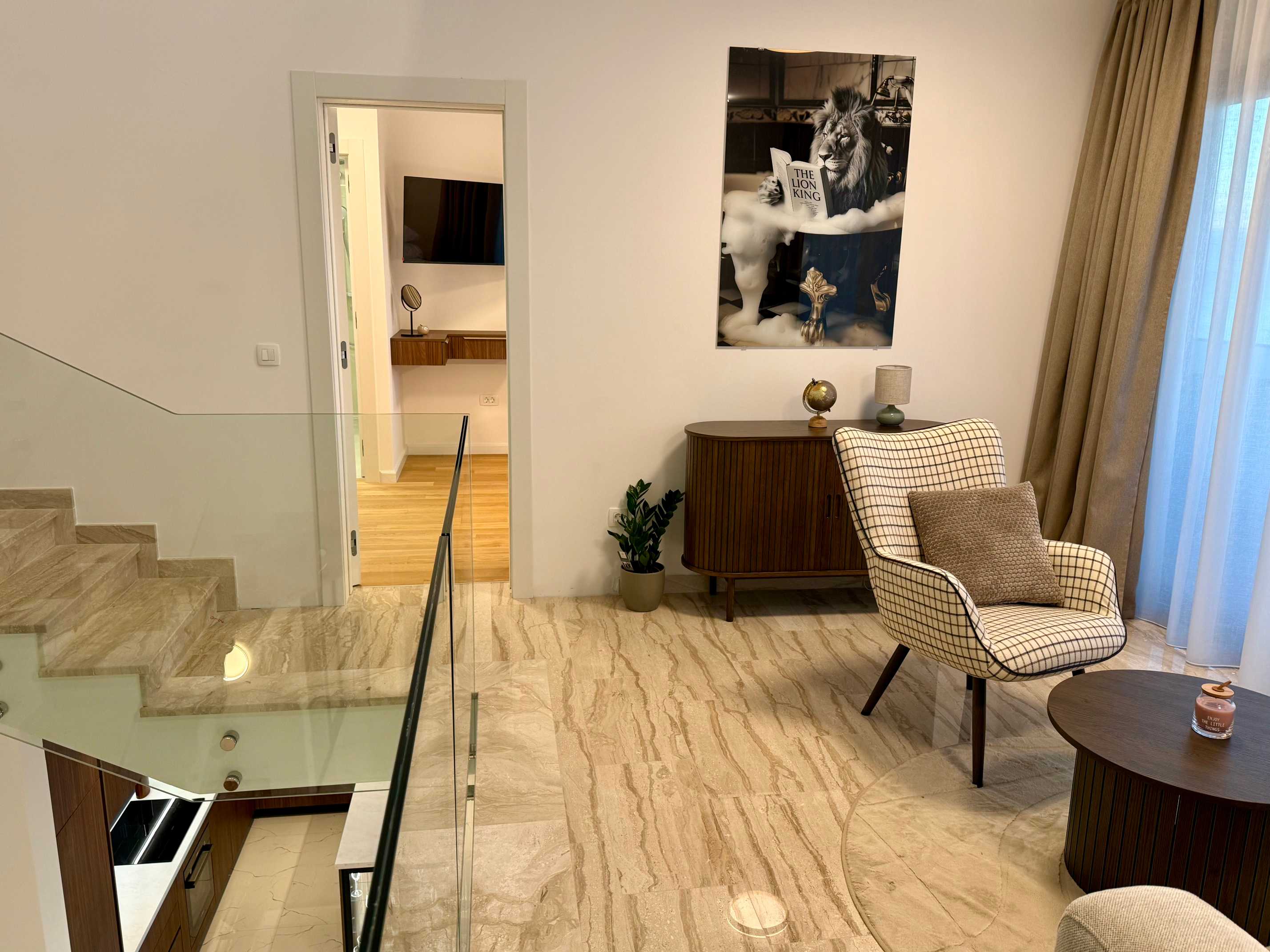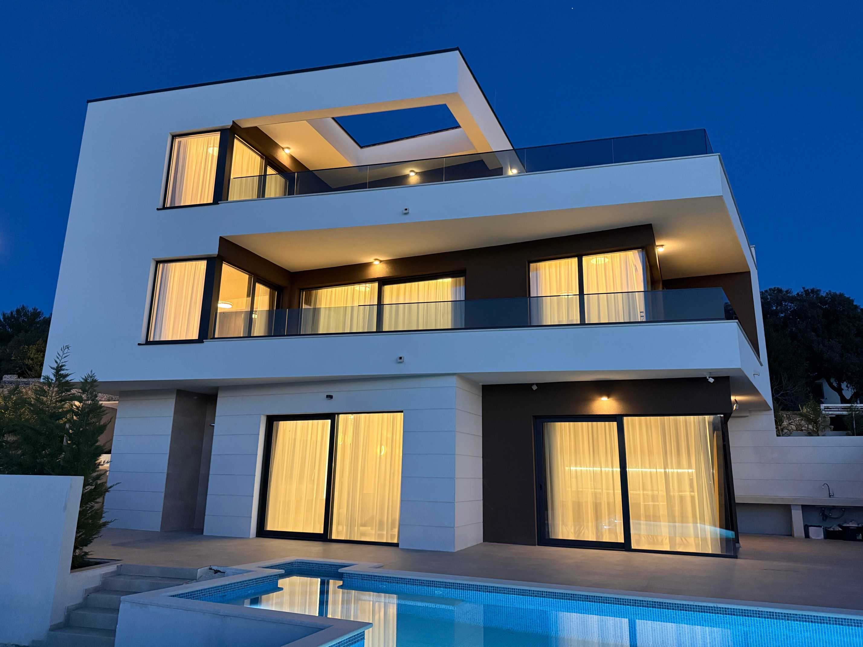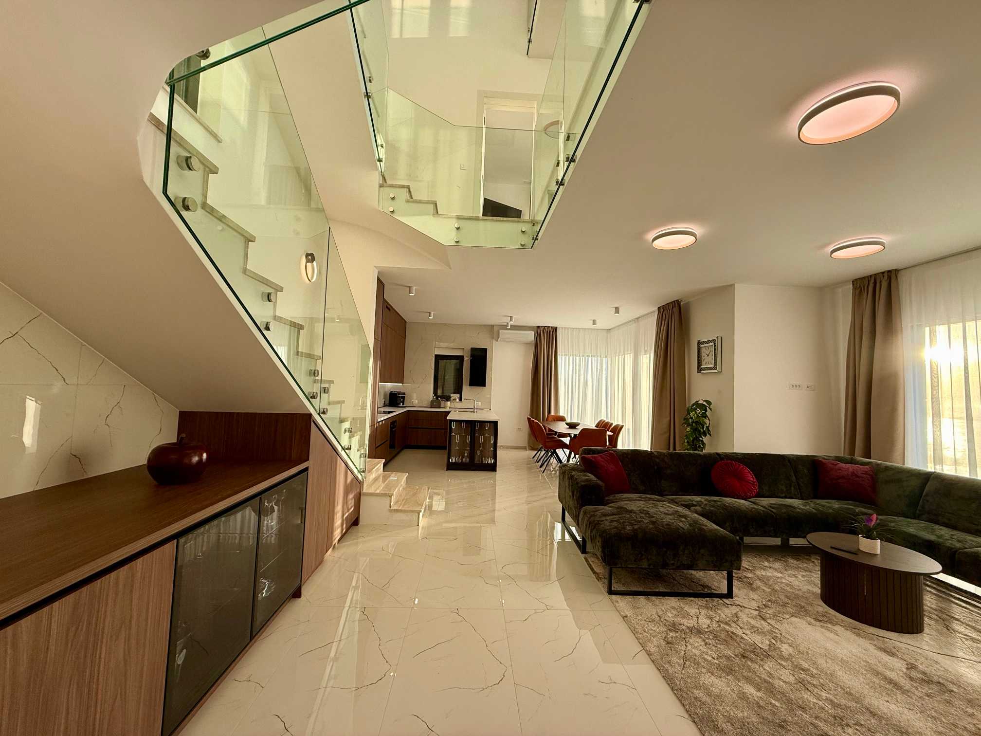 Posebnost interijera je galerija s „lebdećim“ stepenicama od nehrđajućeg čelika koje vode sve do drugog kata, uz velike staklene stijene na svakom nivou. Prvi kat nudi dvije spavaće sobe s vlastitim kupaonicama i dugom terasom te galerijski prostor koji se može koristiti kao teretana ili knjižnica. Na drugom katu nalazi se glavna spavaća soba s velikom terasom i jacuzzijem na vrhu, idealnim za opuštanje uz zadivljujući pogled. Svaki kat ima visinu stropa od 3 metra, što dodatno naglašava luksuz i prostranost doma.
