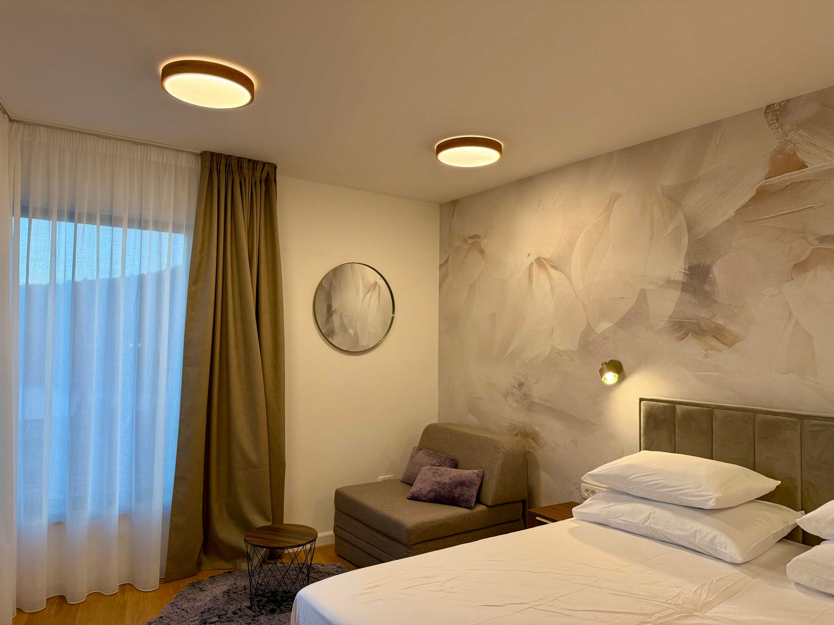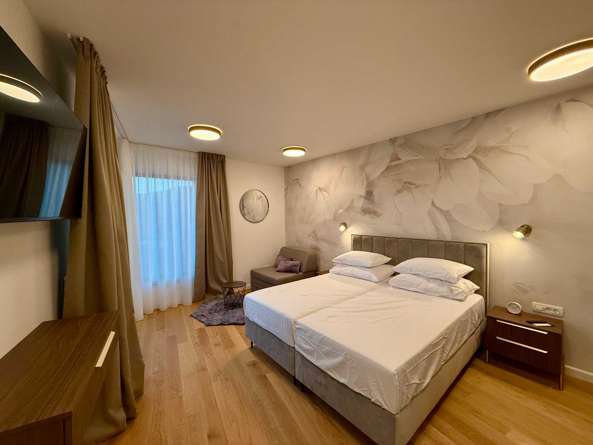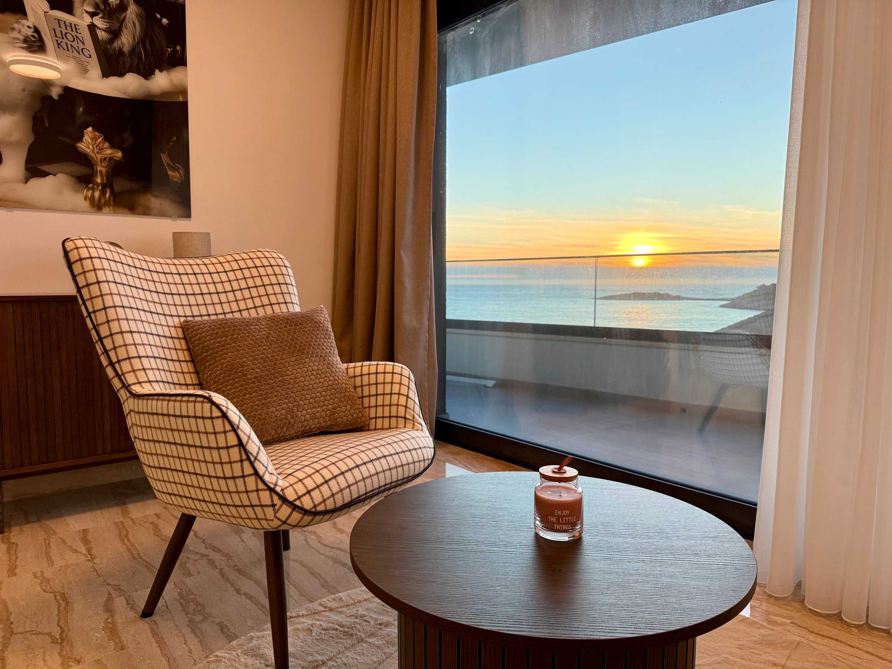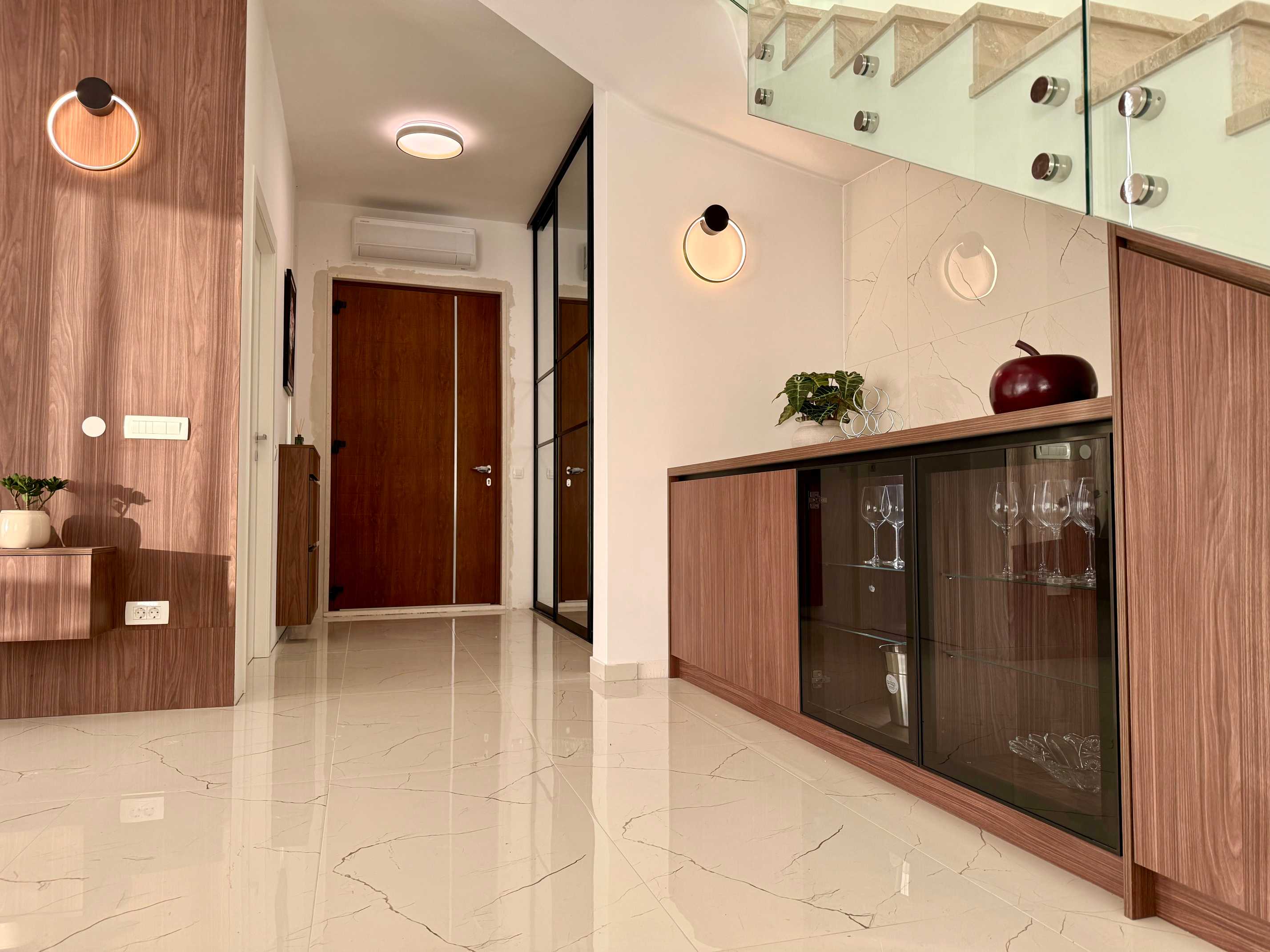 Posebnost interijera je galerija s „lebdećim“ stepenicama od nehrđajućeg čelika koje vode sve do drugog kata, uz velike staklene stijene na svakom nivou. Prvi kat nudi dvije spavaće sobe s vlastitim kupaonicama i dugom terasom te galerijski prostor koji se može koristiti kao teretana ili knjižnica. Na drugom katu nalazi se glavna spavaća soba s velikom terasom i jacuzzijem na vrhu, idealnim za opuštanje uz zadivljujući pogled. Svaki kat ima visinu stropa od 3 metra, što dodatno naglašava luksuz i prostranost doma.