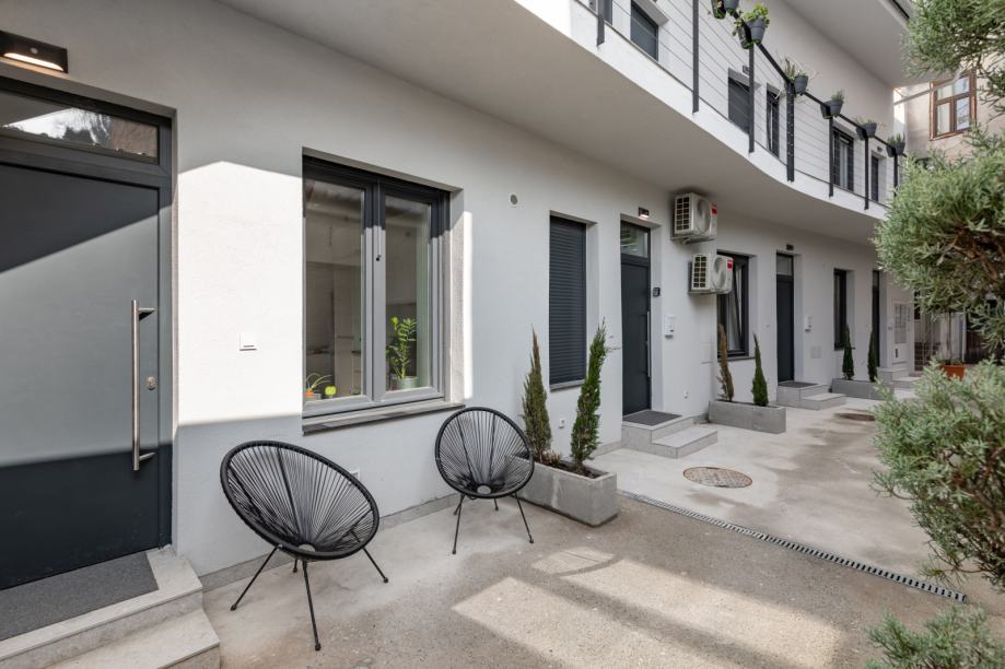 Smješten je unutar mirnog, novouređenog dvorišta te posjeduje terasu i balkon, što ovu gradsku lokaciju čini posebno privlačnom. Stan se prodaje potpuno namješten i opremljen te je odmah useljiv.